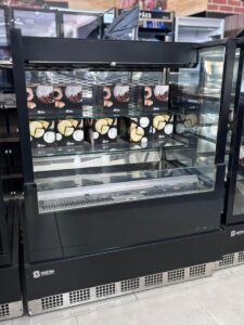 Descrição do equipamento: Refrigeração e exposição de bolos, tortas, doces e confeitos ou bebidas, frios e laticínios Temperatura: ▪ Bolos: +5°C a +10°C Bebidas: +1°… Continue a ler »Balcão Vitrine Refrigerada Vidro Curvo Preto – 1.10m – 220V – Gelopar